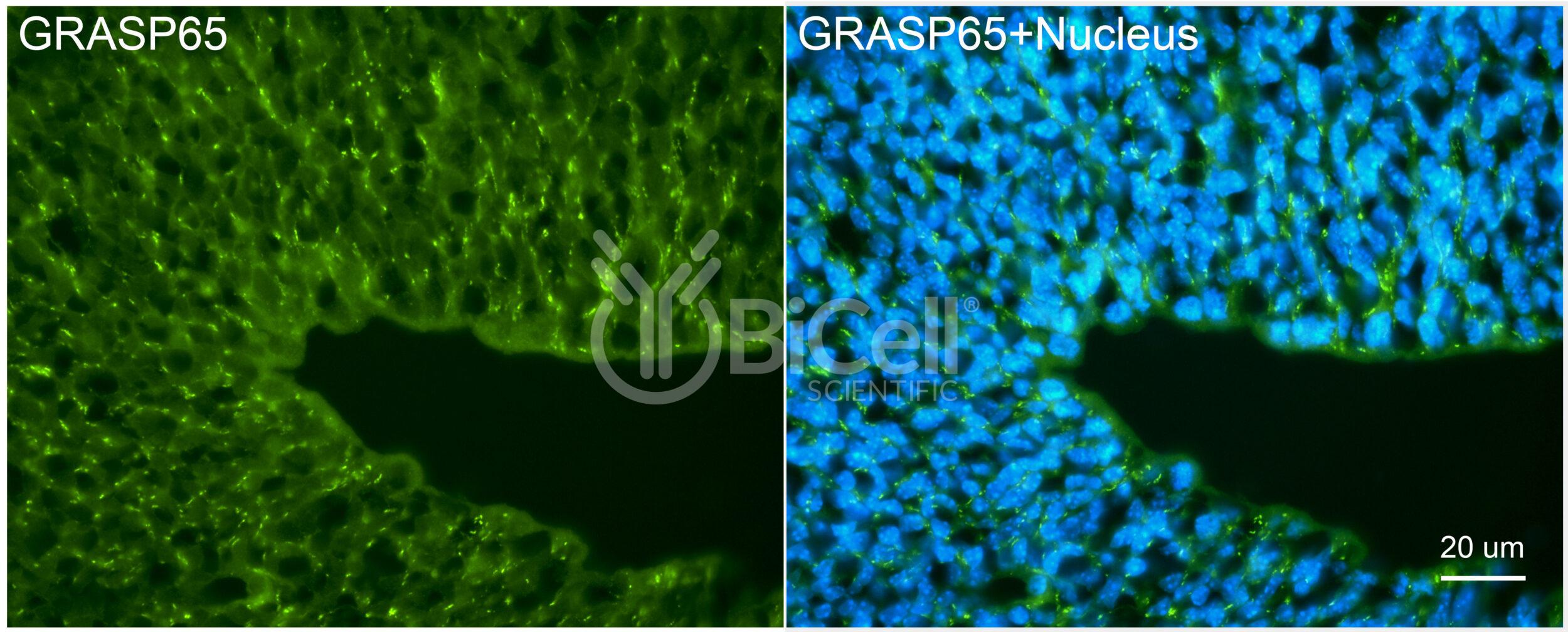 Anti-GRASP65 (GORASP1) antibody is validated on mouse tissue and recommended for immunofluorescence labeling, IHC, or western blot of materials from rodent and human tissues. Golgi reassembly-stacking protein of 65 kDa (GRASP65), also known as Golgi reassembly-stacking protein 1 (GORASP1), is encoded by the GORASP1 gene in human. GRASP65 protein is a peripheral membrane protein anchored to the lipid bilayer through myristoylation of a glycine residue near the proteins amino terminus. It is involved in establishing the stacked structure of the Golgi apparatus and linking the stacks into larger ribbons in vertebrate cells.